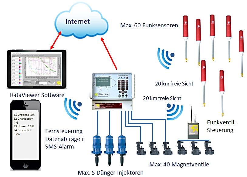 Riego automáticoElemento de escucha 1PlantControl CX es la primera computadora de riego con autoaprendizaje del mundo que evalúa de manera inteligente las lecturas de hasta 60 sensores de humedad del suelo conectados de forma inalámbrica y, además del momento adecuado para regar, también calcula los requisitos efectivos de agua de las plantas.